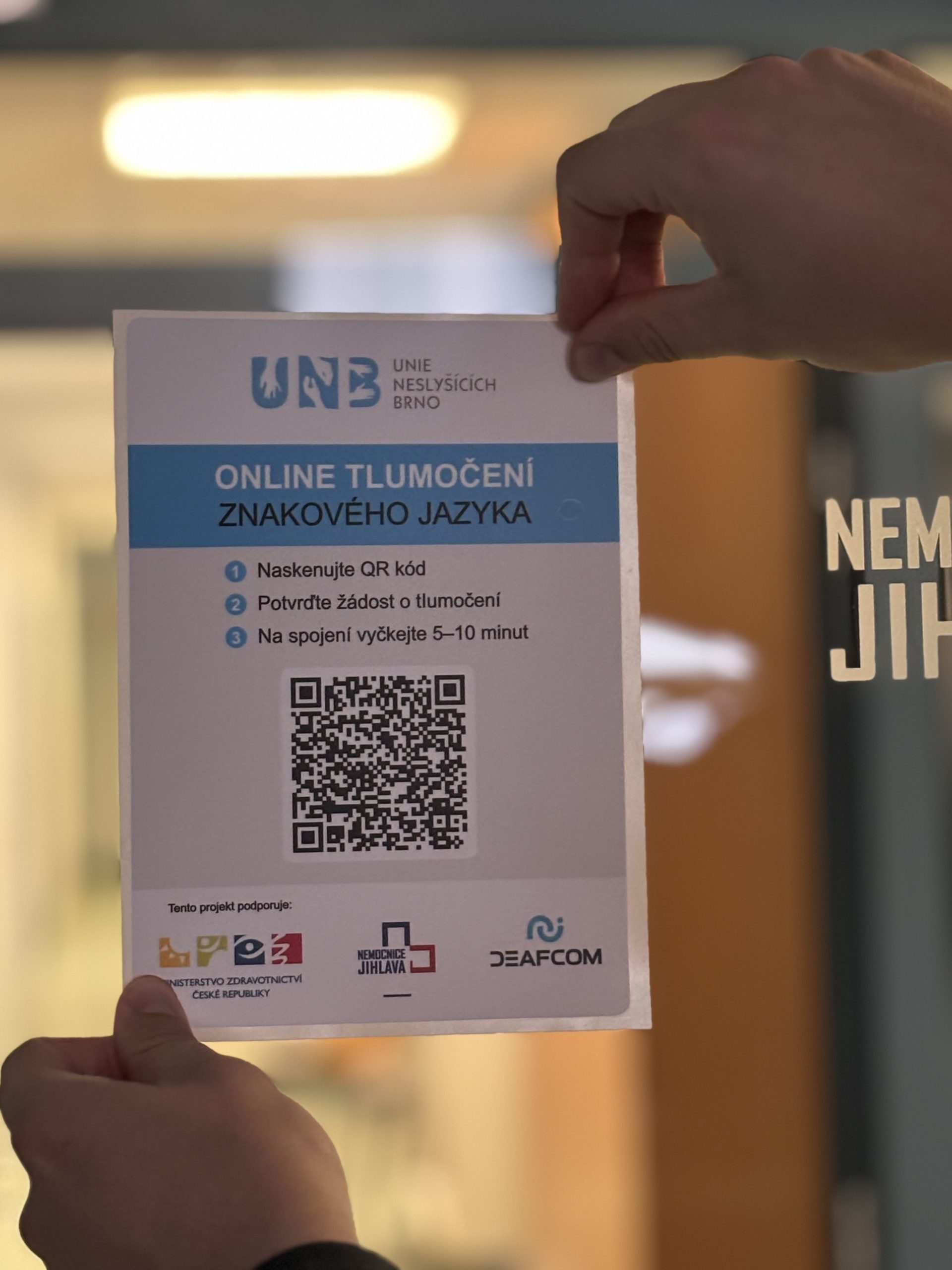 Na odděleních v nemocnici a také v ambulancích jsou k dispozici QR kódy, pomocí kterých se pacienti videohovorem spojí s tlumočníkem. Nemocnice se zapojila do projektu Bezbariérové nemocnice Ministerstva zdravotnictví. Spojení s tlumočníkem je jednoduché: „Stačí mobilem naskenovat QR kód, přes který dojde během pár minut ke spojení s tlumočníkem znakového jazyka z Unie Neslyšících Brno. Tímto způsobem mohou neslyšící pacienti komunikovat se zdravotnickým personálem bez nutnosti předchozí rezervace tlumočníka nebo doprovodu rodinného příslušníka,“ upřesňuje Šárka Humlová ze společnosti Deafcom, která tlumočení technicky zajišťuje.