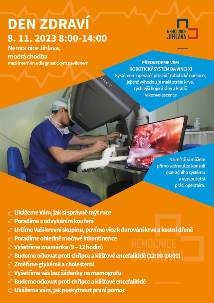 Den zdraví proběhne v modré chodbě spojující interní a diagnostický pavilon. Letošním největším lákadlem bude určitě operační robotický systém Da Vinci XI za téměř 65 milionů korun. Ten využívají v jihlavské nemocnici nejvíce u urologických, gynekologických a chirurgických výkonů. Lékař díky němu provádí zákrok z operačního sálu, ale v určité fázi bez přímého kontaktu s tělem pacienta. „Robotická technologie řeší složité a náročné operace z několika vpichů, podobně jako laparoskopie, avšak umožňuje větší rozsah pohybu, je velmi precizní. Studie srovnávající všechny typy operací, od otevřených přes laparoskopické až po roboticky asistované, prokazují výhody robotického přístupu v řadě operací, proto jsou vyhledávané. Rekonvalescence a návrat do běžného života jsou po robotickém zákroku velmi rychlé,“ jmenuje primářka gynekologicko-porodnického oddělení Petra Herboltová, která na místě také bude osobně a poví zájemcům více o robotických operacích. Možné bude také sednout přímo za ovládací konzoli robota a vyzkoušet si práci operatéra.