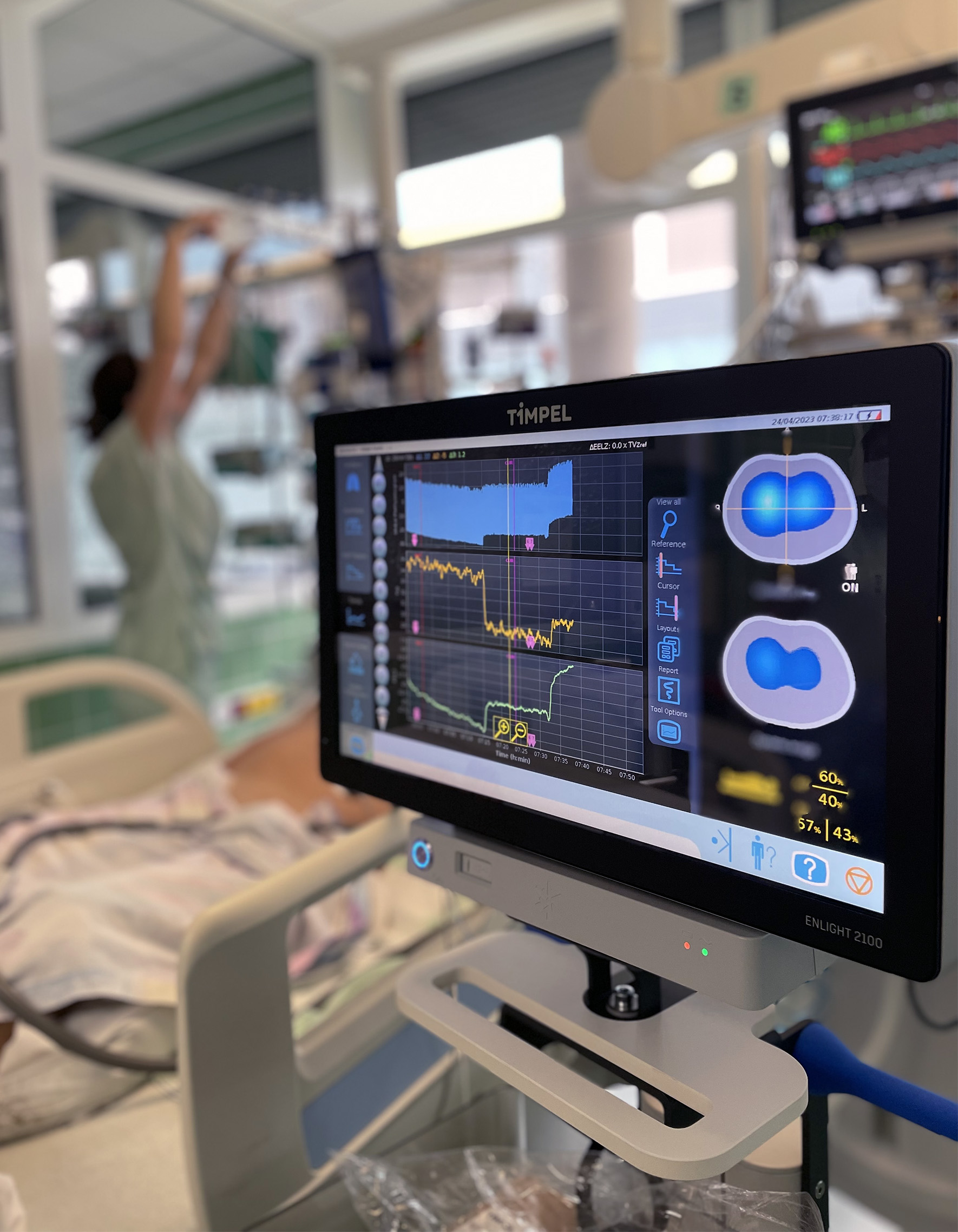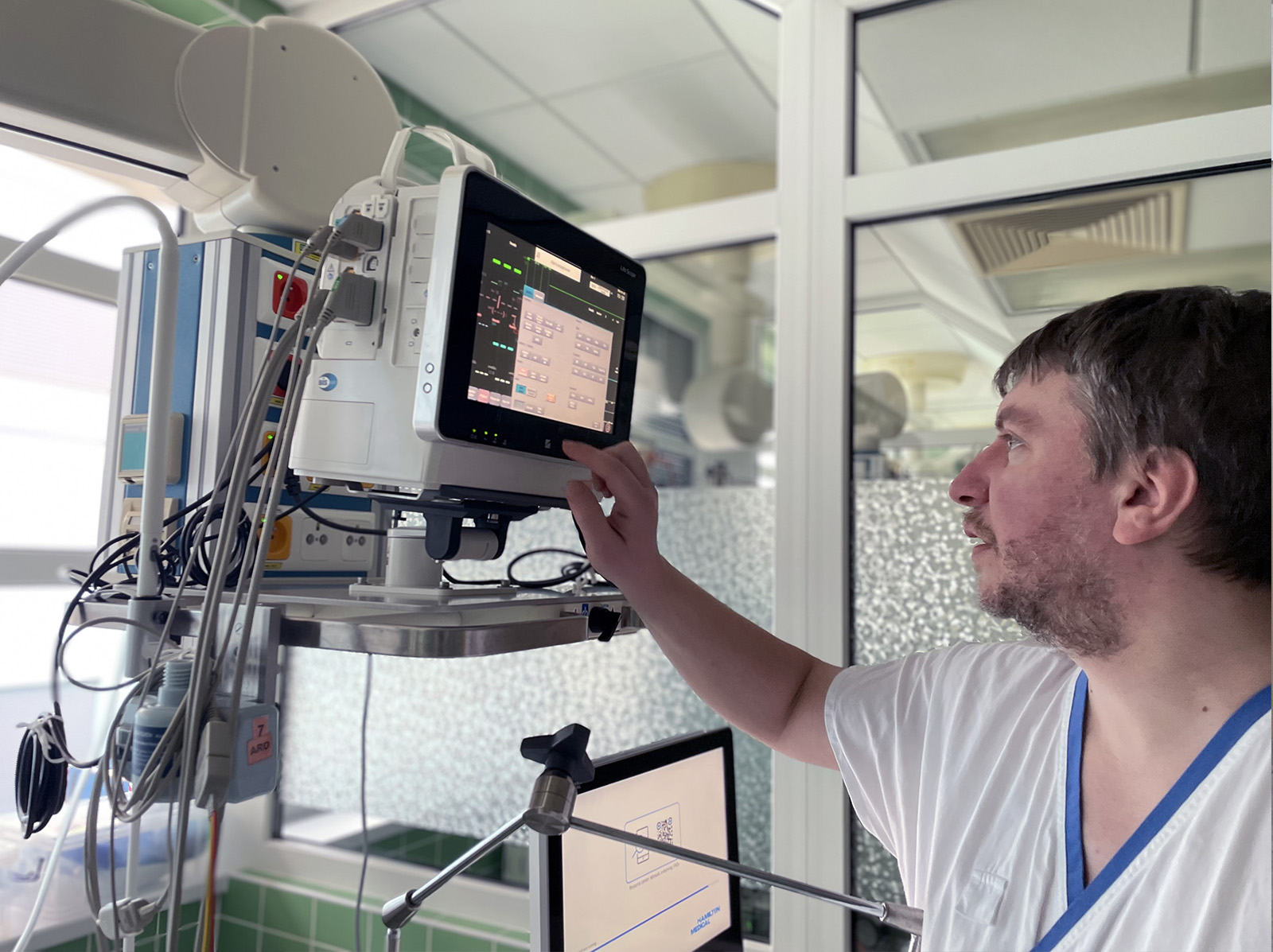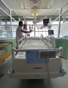 „Nejvyšší intenzivní péče je poskytována na šesti lůžkách nadkrajského pracoviště – stavebně, technicky a personálně uspořádaného provozu s ohledem na maximální komfort a bezpečnost kriticky nemocného pacienta. Resuscitační stanice je vybavena moderní technikou, možností okamžité bed-side sonografie k diagnostice i výkonům, sledování stavu plic pomocí elektrické impedanční tomografie, možností invazivní i neinvazivní monitorace krevního oběhu, EEG modulem a sledováním úrovně bdělosti pacienta prostřednictvím bispektrálního indexu, přístroji ke stanovení acidobazické rovnováhy, koagulačních parametrů (ClotPro). Samozřejmostí je okamžitě aplikovatelná kontinuální přístrojová substituce funkce ledvin (CVVHD) nebo akutní videobronchoskopie při náhlé obstrukci dýchacích cest.