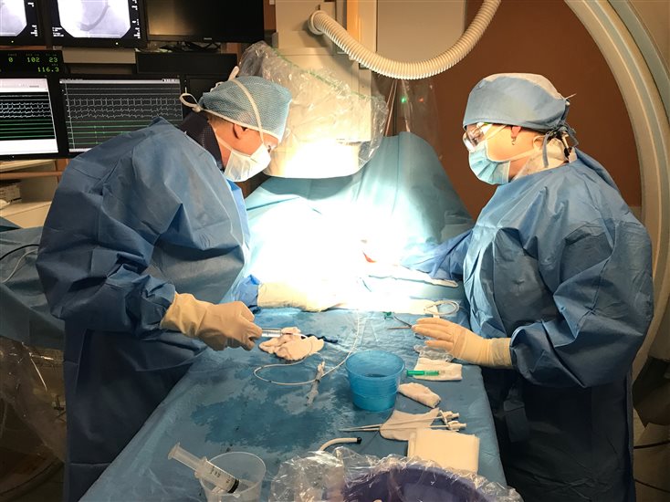 Elektrofyziologické vyšetření Katétrová ablace je metodou léčby některých poruch rytmu. Ablace spočívá ve „vypálení“ místa, které je za arytmii zodpovědné, a to pomocí katétrů (cévek), jimiž se teplo do daného místa v srdci dodává. Typicky se katétry zavádějí z pravého nebo někdy z obou třísel. V některých případech je nutné arytmii vyvolat tak, aby byl vyšetřující lékař schopný zjistit, odkud tato arytmie vychází. Úspěšnost katétrové ablace se u některých arytmií blíží ke 100 % (např. ablace flutteru nebo pravidelné supraventrikulární tachykardie), u jiných je nižší a může se pohybovat mezi 70 a 80 % (např. u paroxysmální fibrilace síní) anebo je i pod 50 % (např. u perzistující fibrilace síní).