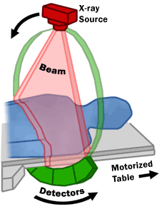 • Jedná se o zařízení pracující s rentgenovým zářením podobně jako běžný RTG přístroj, u CT (computed tomography) však rotuje zdroj záření – rentgenka i detekční systém okolo těla pacienta, který je tak ozařován postupně z různých úhlů po celém obvodu těla. Detekční systém pak vyhodnocuje množství záření procházející tělem pacienta pod různými úhly a z těchto dat jsou následně pomocí výkonného počítače zrekonstruovány jednotlivé scany – obrazy vrstev těla zpravidla v axiální rovině.