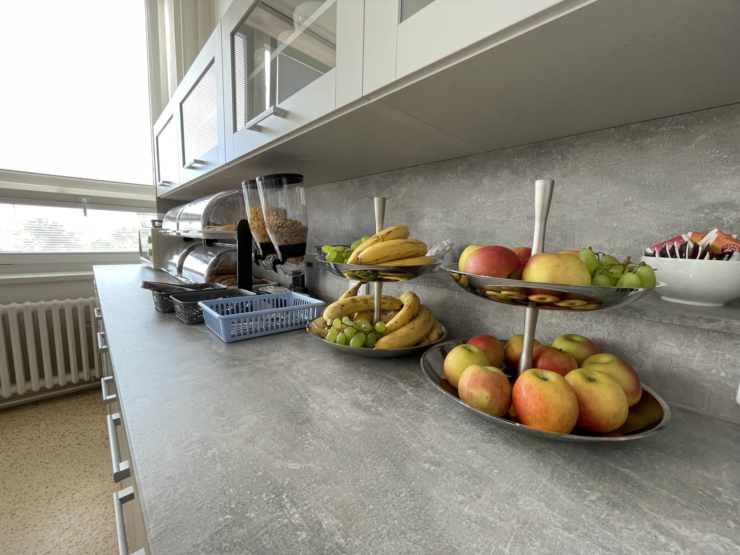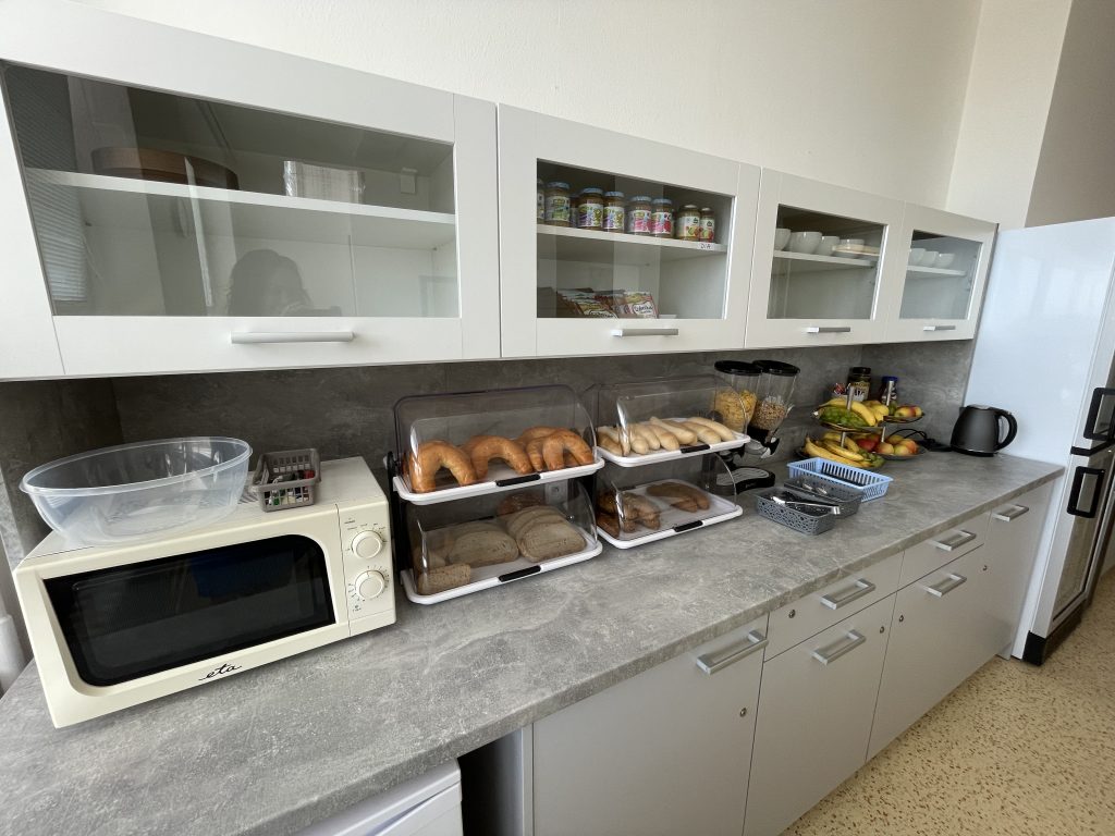 Maminky si mohou vybrat z několika druhů pečiva, mléčných výrobků, šunky, cereálií, ovoce i zeleninu. Lednice jim kromě snídání zůstává na oddělení k dispozici celý den.